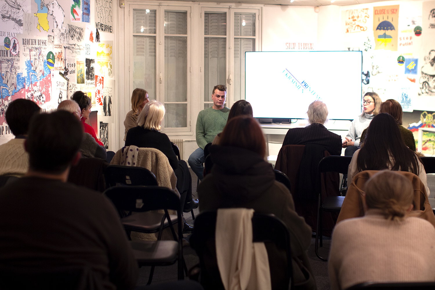 Після показу відбулась дискусія, в якій взяли участь українські та французькі волонтери: режисерка фільму Олена Грозовська, історикиня та дослідниця  Дар'я Добріян, театральний продюсер та видавець Dominique Dolmieu, та музикантка і культурна активістка Maryna Voznyk (Марина Вознюк), українка за походженням, організаторка концертів українських і французьких музикантів на підтримку України. Розмову модерувала активістка та волонтерка Мар’яна Перебенисюк, українка за походженням, яка давно мешкає у Франції і є активною учасницею мітингів та телеефірів, присвячених війні в Україні.